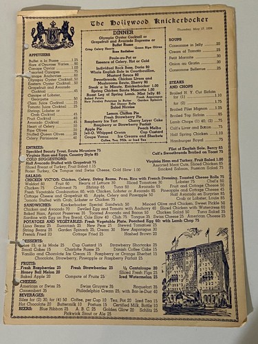 Original 1934 Hollywood Knickerbocker Dinner Menu Ebay